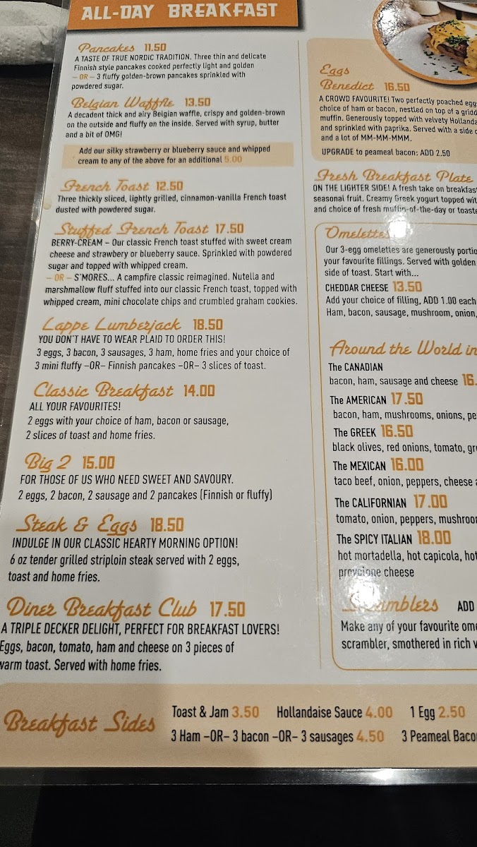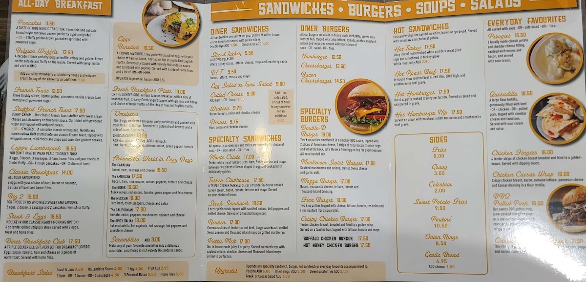 Start your day with warming favorites like the Finnish Pancake Breakfast or the All Meat Egg Omelette, perfect for those who enjoy a substantial morning meal with familiar flavors. At midday or later, you’ll find comforting sandwiches and plates such as the Reuben Sandwich or the Hamburger Nip served alongside crisp onion rings, ideal for a laid-back, satisfying bite.